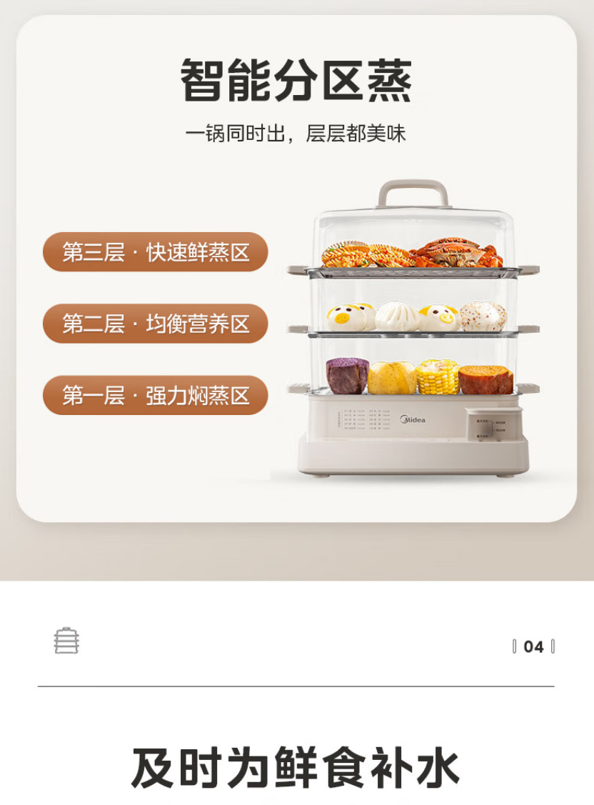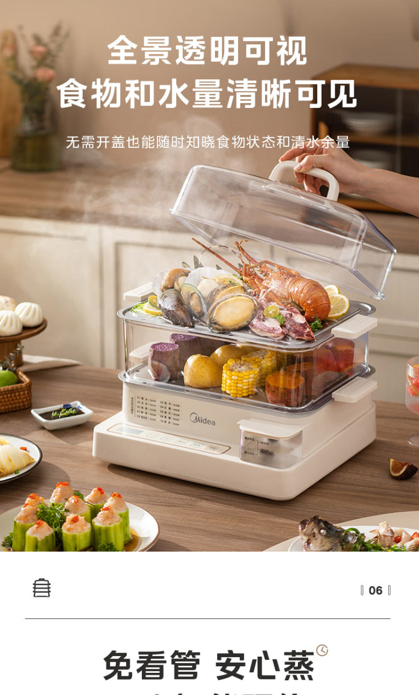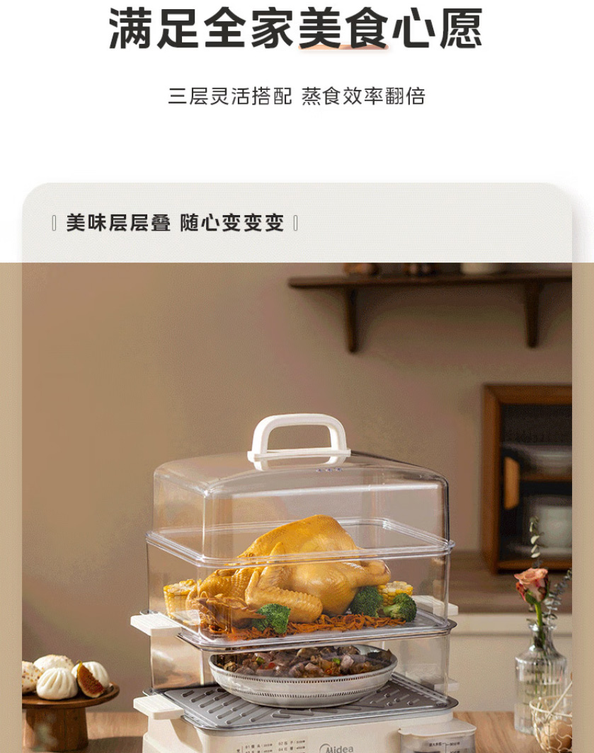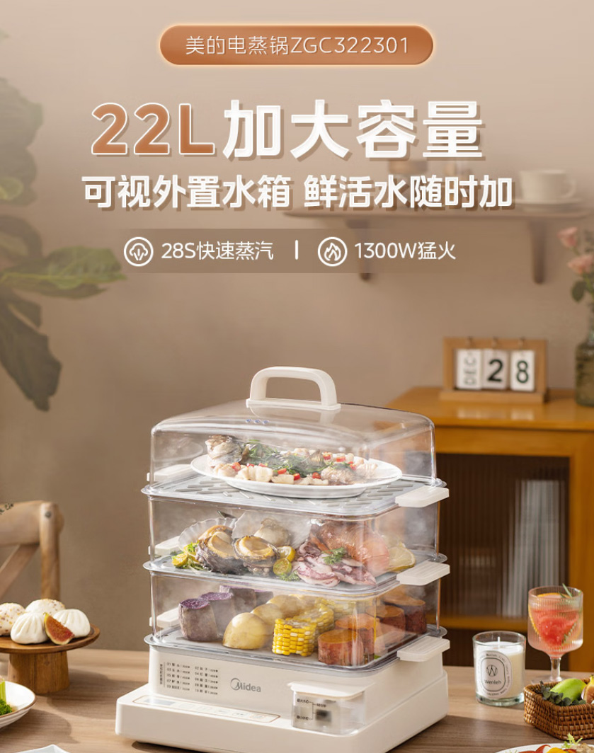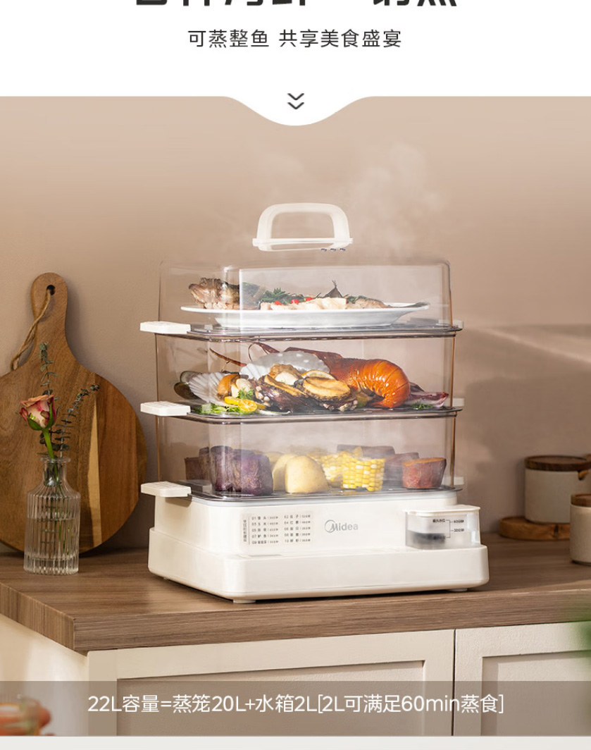 首页 >> 美的(Midea)电蒸锅 22L三层大容量外置加水蒸锅电蒸锅 透明视窗不锈钢蒸片多用途蒸包子锅多功能锅ZGC322301