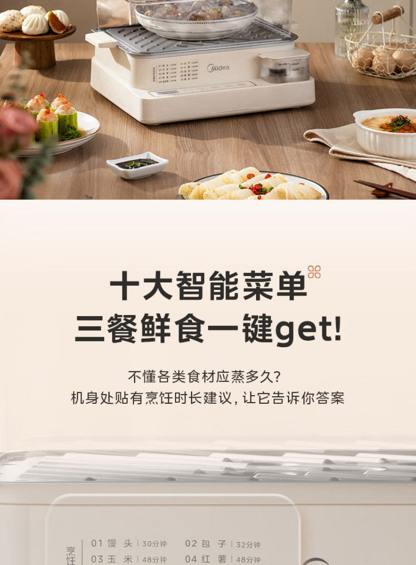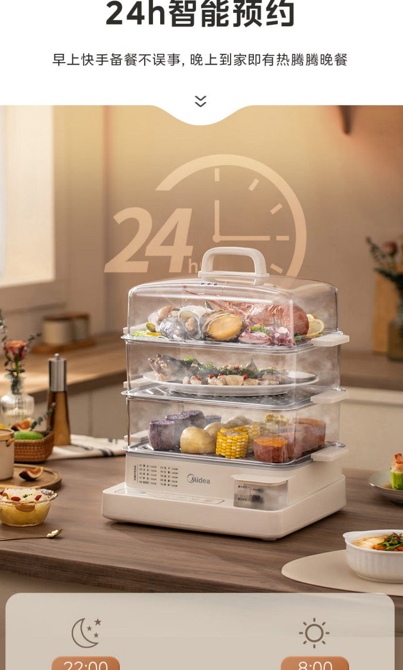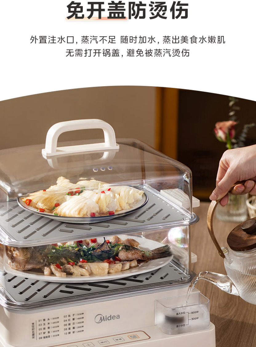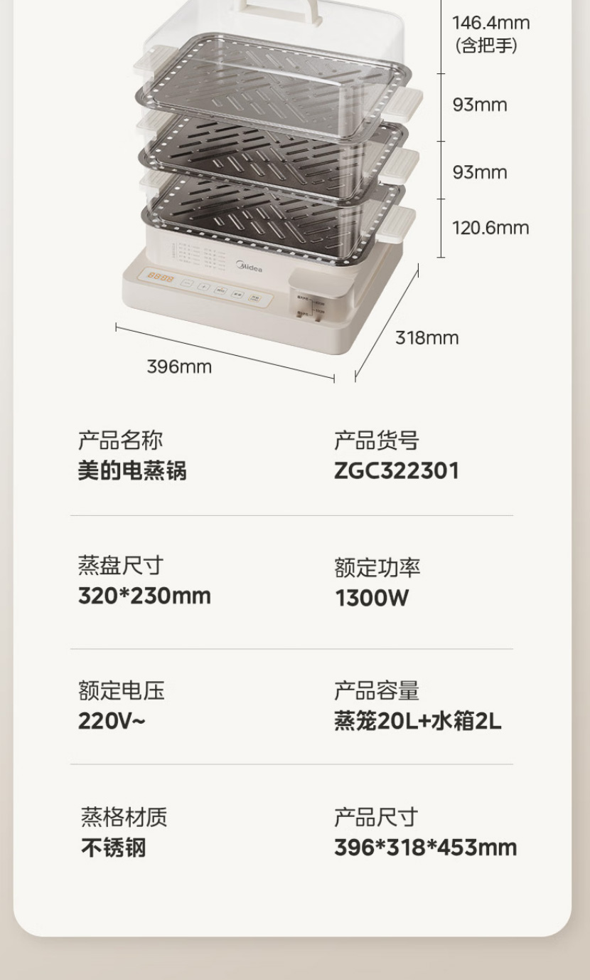 首页 >> 美的(Midea)电蒸锅 22L三层大容量外置加水蒸锅电蒸锅 透明视窗不锈钢蒸片多用途蒸包子锅多功能锅ZGC322301