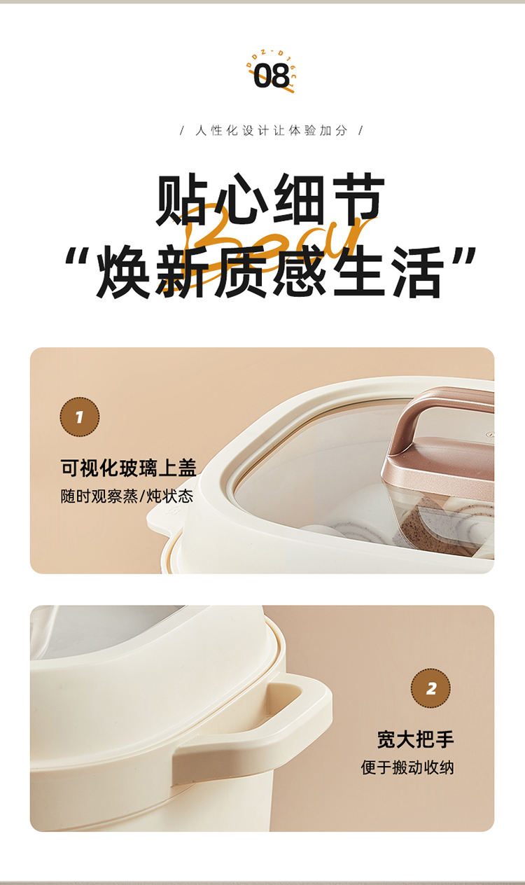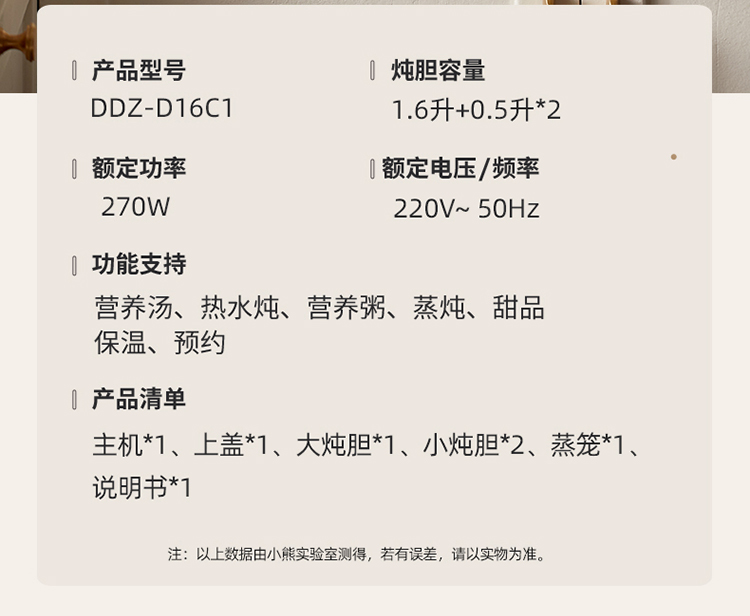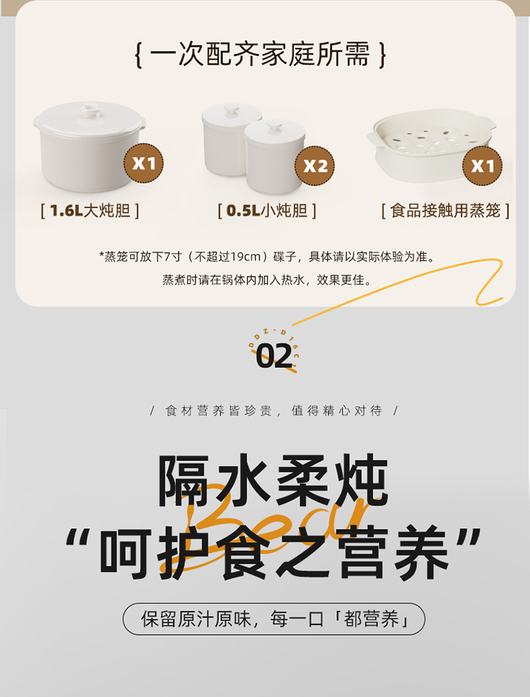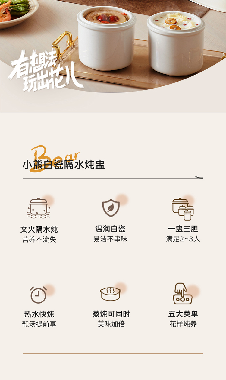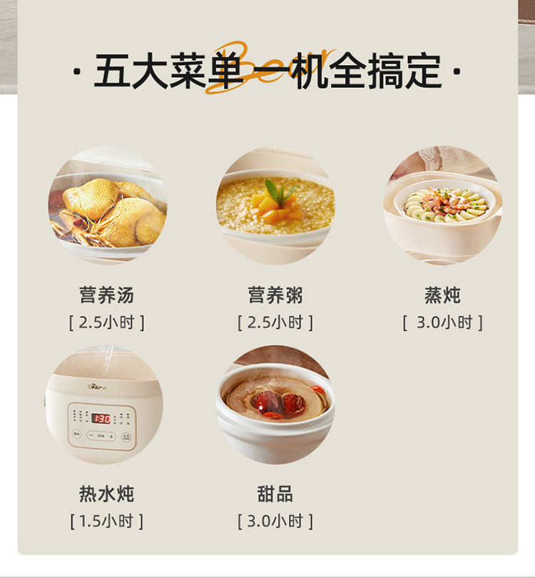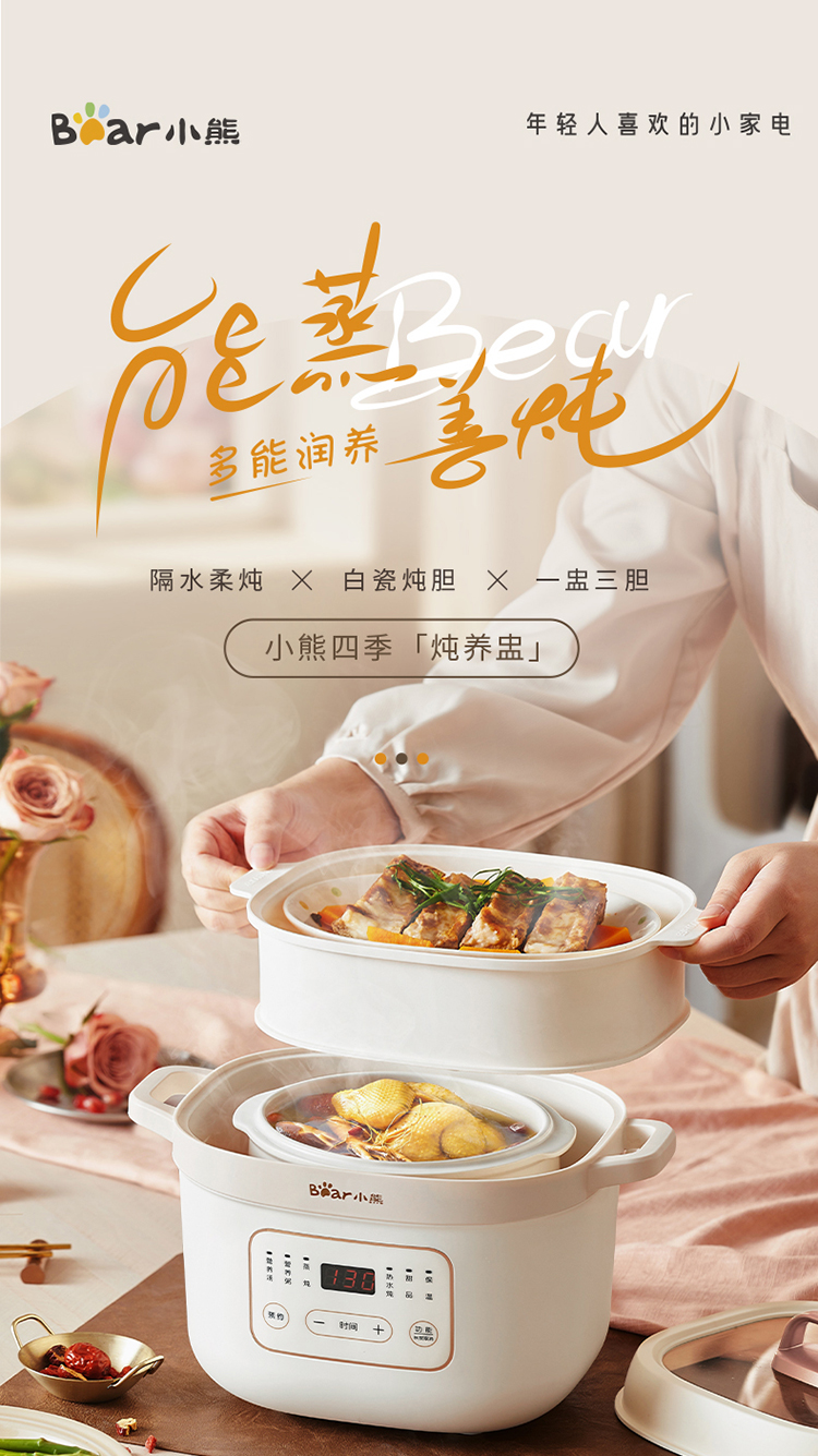 首页 >> 小熊(Bear)电炖锅 电炖盅 隔水炖锅 煲汤锅 炖汤盅 蒸锅 婴儿辅食锅煮粥锅燕窝可预约带蒸笼DDZ-D16C1 1.6L