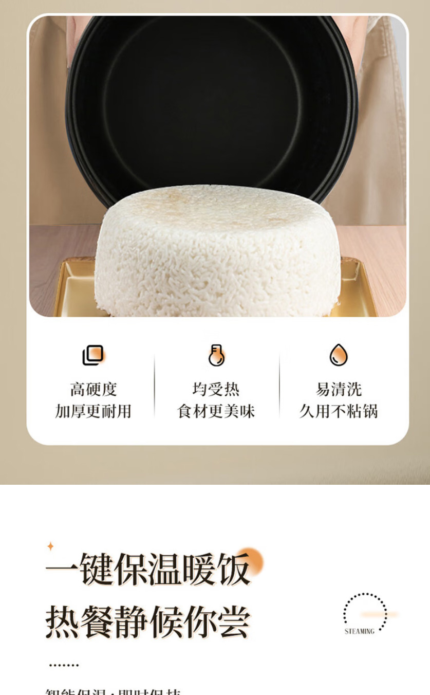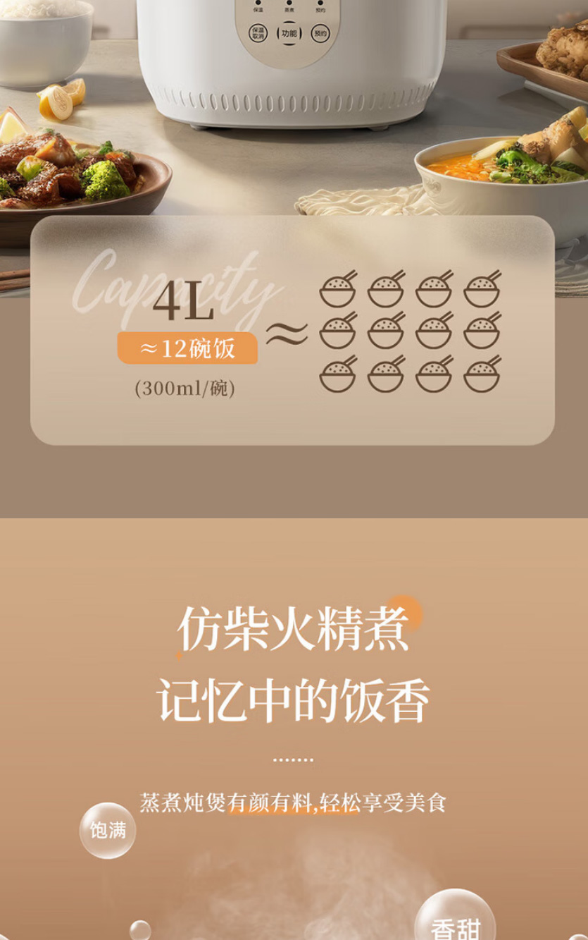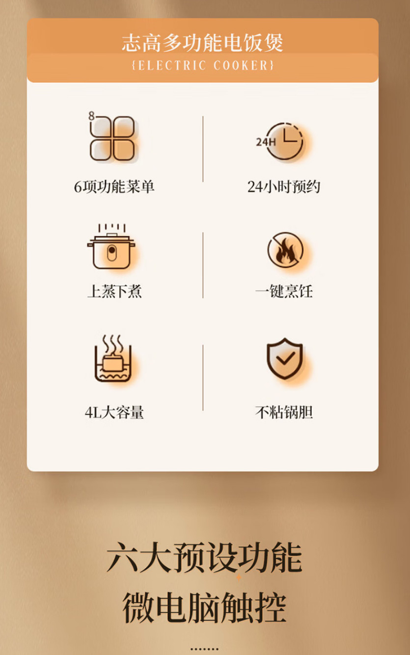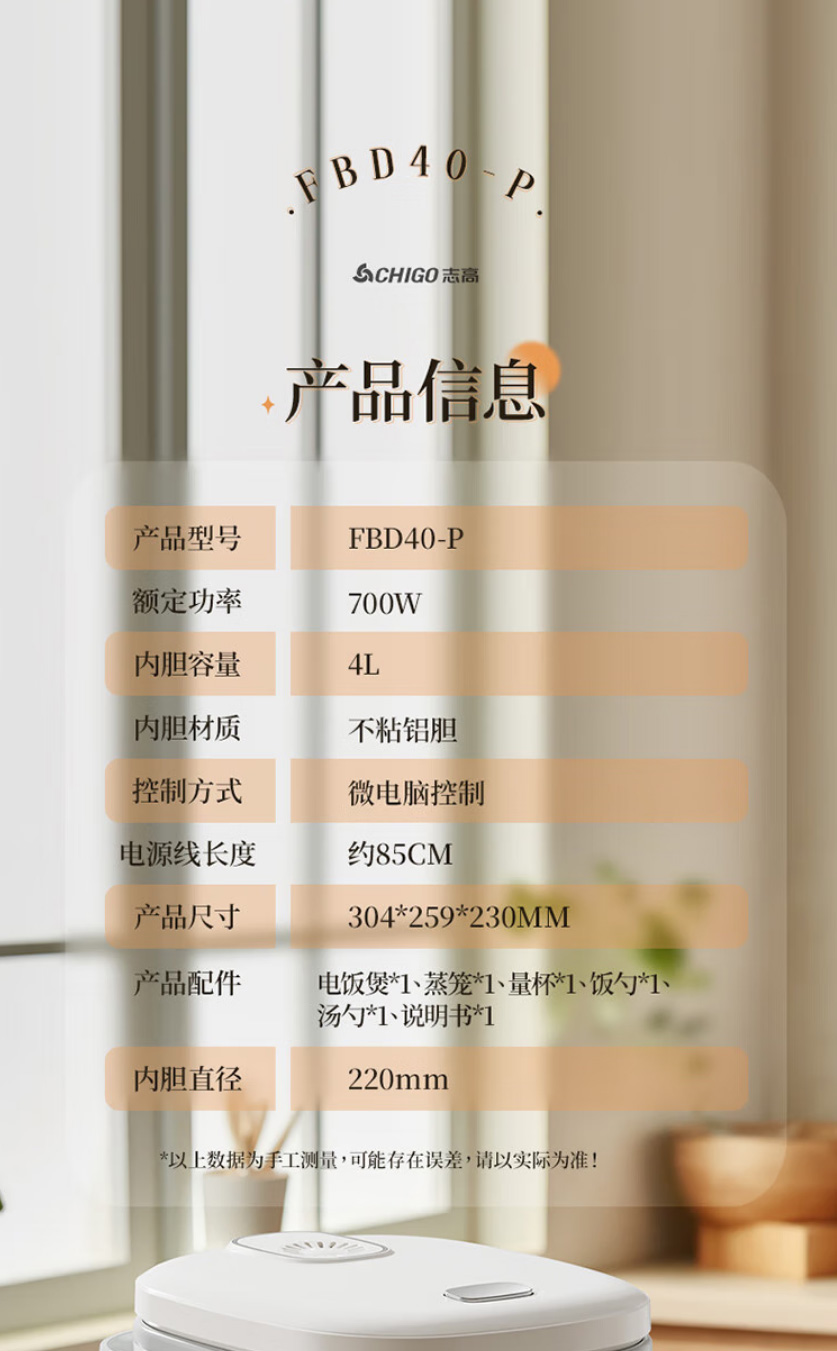 首页 >> 志高志高(CHIGO)电饭煲4L 家用电饭锅 24H智能预约蒸煮米饭锅 配蒸屉 FBD40-P