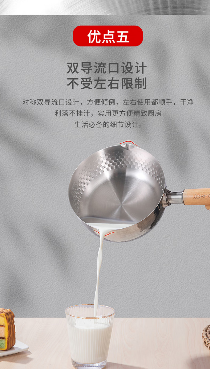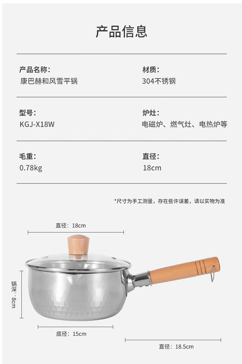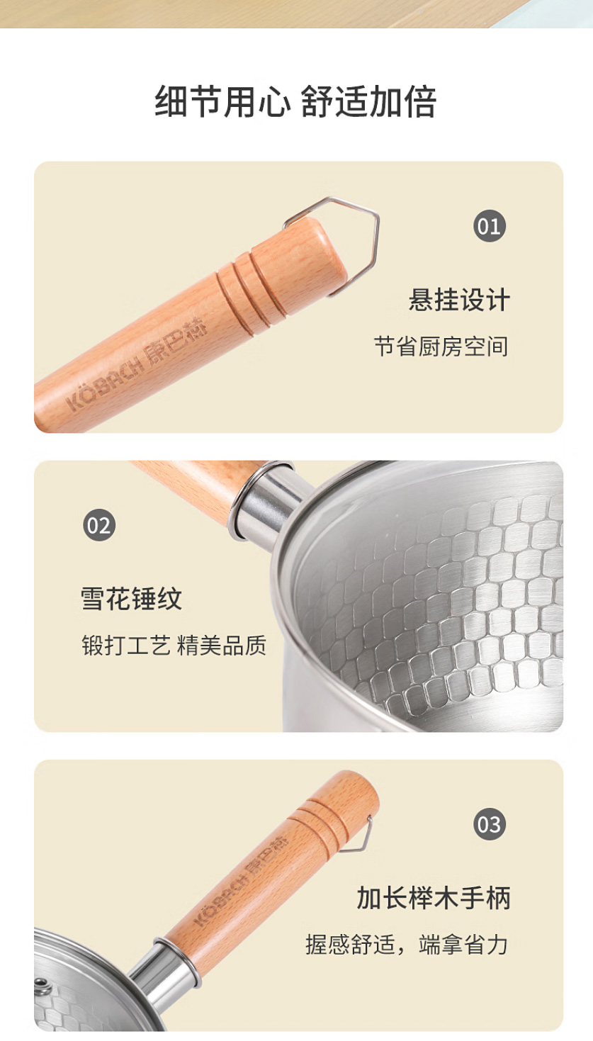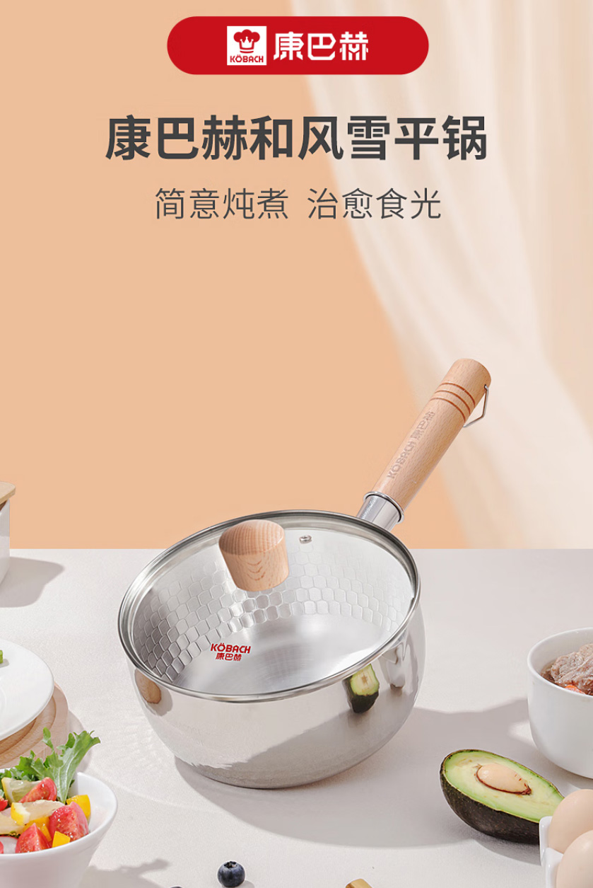 首页 >> 康巴赫304不锈钢不粘轻量雪平锅双导流口炖煮可悬挂带盖18cm不挑炉灶 KGJ-X18W